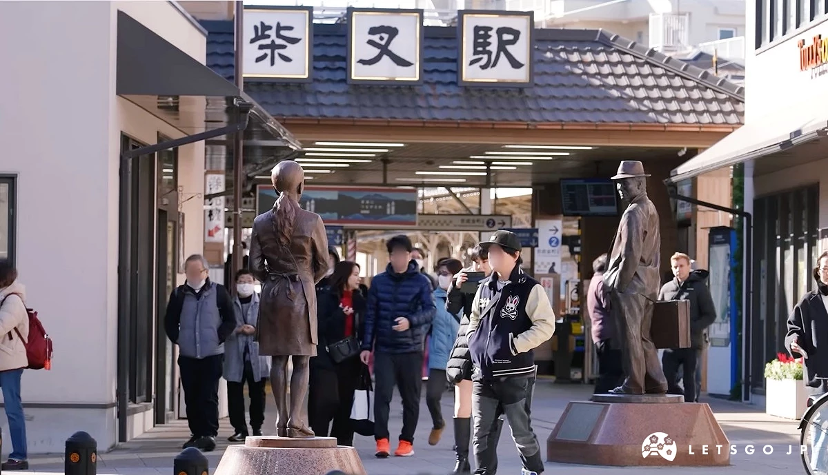 在1968年(昭和43年)至1969年(昭和44年)間播放的日本國民電視劇「男人真命苦」大受歡迎,提著公事包帶著紳士帽的男士就是主角「車寅次郎」,當時影集以柴又為拍攝場景,這尊銅像也是由當地商店街集資打造。