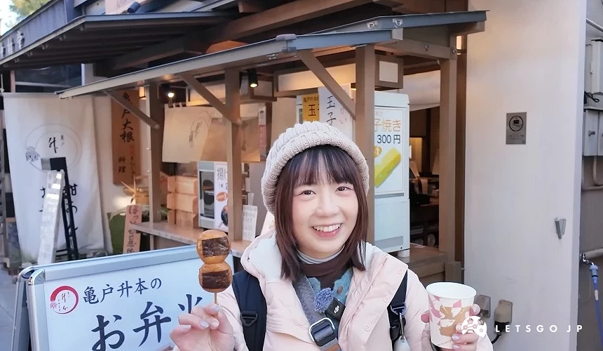 「亀戸升本すずしろ庵 柴又店」由東京老字號「亀戸升本」經營,是主打賣手作便當的店家,但烤糰子跟玉子燒串等輕食對觀光客來說非常有人氣,最適合來體驗邊走邊吃,也有賣甘酒。
