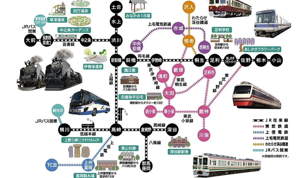 群馬一日券(ぐんまワンデーパス)是群馬縣內及周邊旅行的數位一日乘車券,可在JR普通列車、部分私鐵(上信電鐵、上毛電鐵、東武鐵道部分區間、わたらせ渓谷鐵道普通列車)以及指定路線巴士自由乘坐一天。僅限在手機購買(GunMaaS 官網),使用時需在手機上啟動。新幹線與特急列車需另付費,非常適合一天內多點巡遊草津、伊香保等群馬主要觀光景點。
