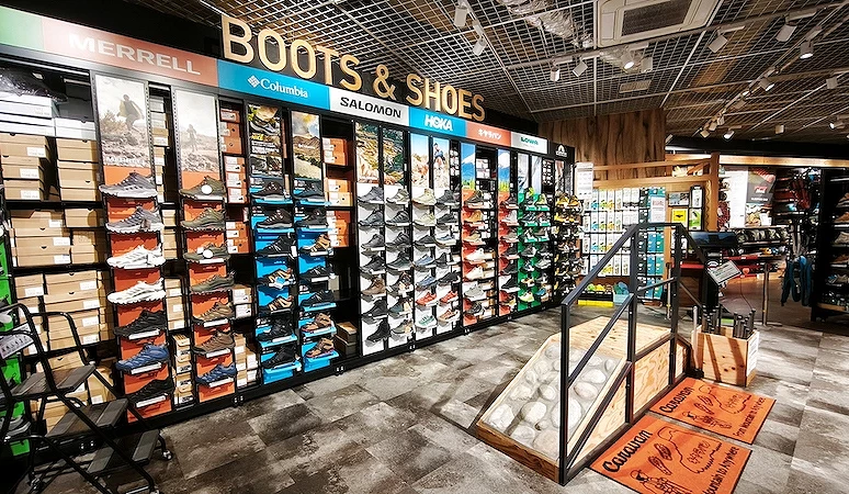 本區登山用品一應俱全!涵蓋從低海拔山岳、富士登山到3,000公尺級高山所需的各式裝備與豐富配件。鞋款方面,備有100個品項、超過700雙登山鞋,從入門健行鞋到專業高山靴一應俱全;背包類則提供250個品項、超過500款登山背包,無論是日間輕健行、富士山登頂、還是無雪期的阿爾卑斯山系縱走,都能在此找到各式各樣登山風格的專業裝備!
