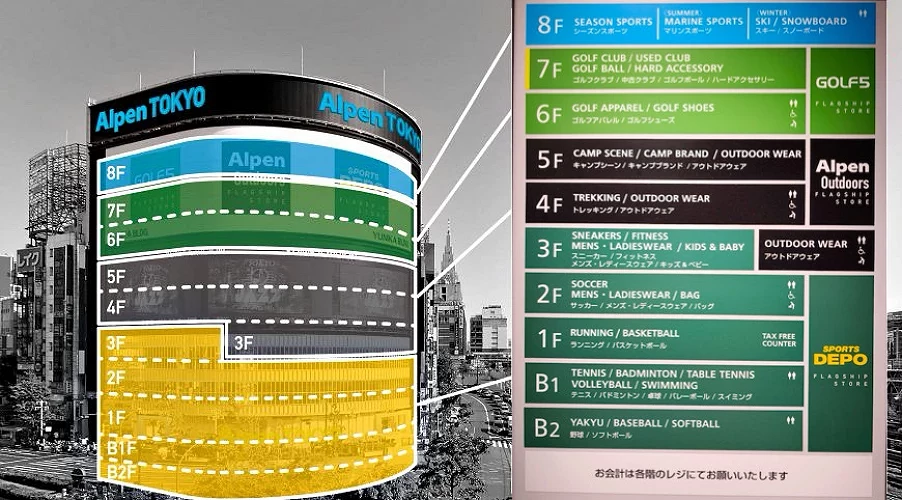 「Alpen Group」是日本最大的運動用品零售商,從北海道到沖繩共超過390家店面,主流到小眾、各類型運動用品都有販賣。2022年4月在新宿開設的「Alpen TOKYO」是集結了運動用品「SPORTS DEPO」、戶外運動專用「Alpen Outdoors」、高爾夫球專門「GOLF5」3大類的綜合設施,3,721坪的賣場面積逛一整個下午都不膩!