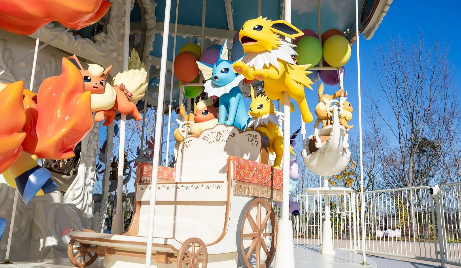 園區內設有伊布主題旋轉木馬「布伊布伊布步遊(ブイブイヴォヤージュ)」,可搭乘由伊布、雷伊布、火伊布,以及小火馬、烈焰馬牽引的座車,或是乘坐繫著氣球、彷彿在空中飛翔的座椅,體驗宛如環遊世界般的夢幻旅程。此外,還有由超過 30 隻電屬性寶可夢驅動的乘坐型遊樂設施「閃亮亮樂園(ピカピカパラダイス)」,能與皮卡丘們一同享受充滿活力的遊玩時光。