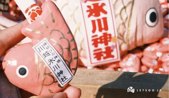 冰川神社還有個非常可愛的御神籤,不是用抽的,不是用選的,是用釣的喔!紅色代表的是招福一年安鯛、粉紅色則代表良縁あい鯛,在神籤旁邊有著釣竿,綁著假餌,投完錢後就可以拿著釣竿釣隻屬於自己的鯛囉!