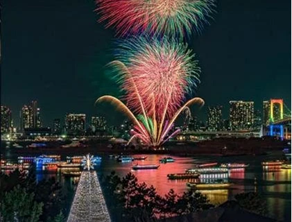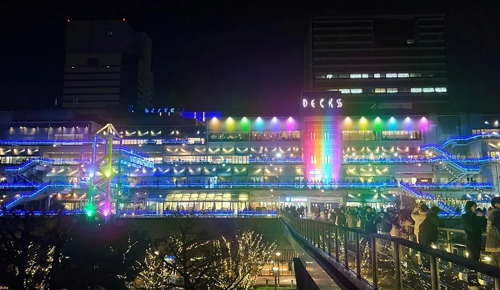 在12月20日(六)與12月24日(三)兩晚,燈光秀將與「台場彩虹花火大會(お台場レインボー花火2025)」聯動登場。當晚DECKS外牆將化身為七彩光幕,隨著音樂與煙火節奏閃爍變化,整個海灣被彩光與火花交織包圍。特別是聖誕夜當天,彩虹大橋與煙火倒映在海面上,浪漫程度直逼電影場景,是東京冬夜中最絢爛的時刻。