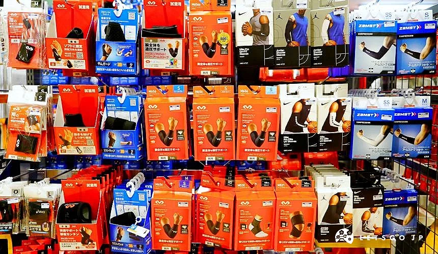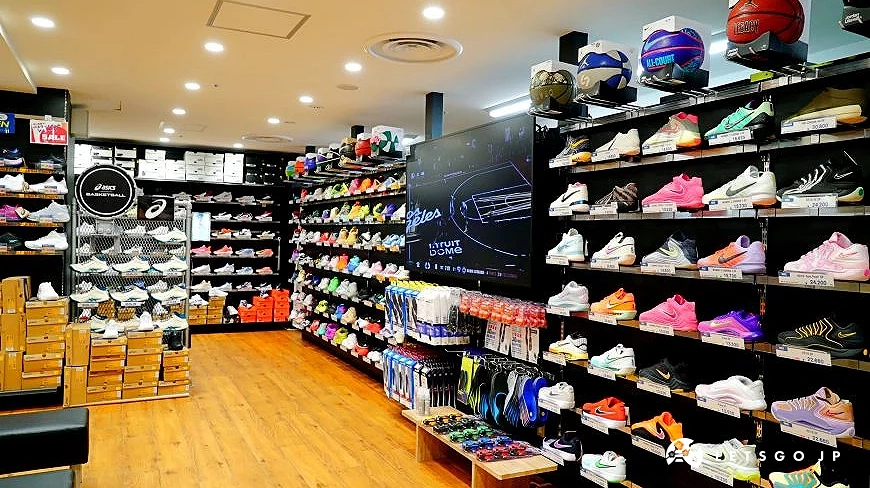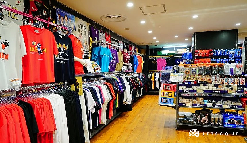 身為籃球、排球專門店,整層坐擁超過20,000項商品。從球鞋、球衣、T恤、籃球、排球、襪子、包包,還能買到 NBA 各球隊的隨身包、獨家T恤等周邊用品。其中在一般店鋪都難找的30公分以上超大尺寸球鞋,在這裡也買得到,另外還有海外、日本國內自產的防護用具,從護膝、護腕基本款,到護指、護肩、齒套等品項細緻,吸引不少專業運動員特地購買。