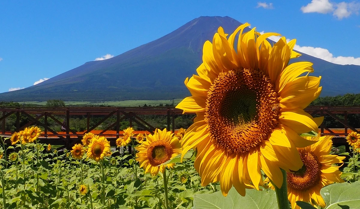 向日葵的最佳觀賞期為8月中到8月下旬,在「山中湖花之都公園」可以欣賞到以富士山為背景、明豔盛放的10萬株向日葵,感受被澄黃花海環繞的震撼。園中也有觀賞期落在9月下旬至10月上旬的晚開向日葵(遅咲ひまわり),因此8月中至10月上旬都可以欣賞到活力盛放的向日葵。