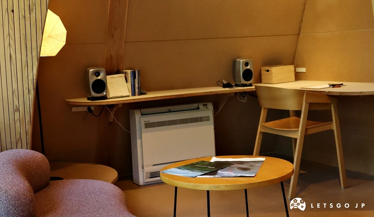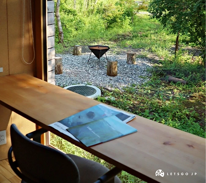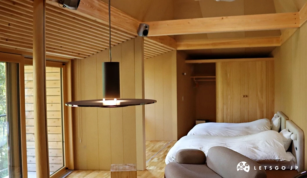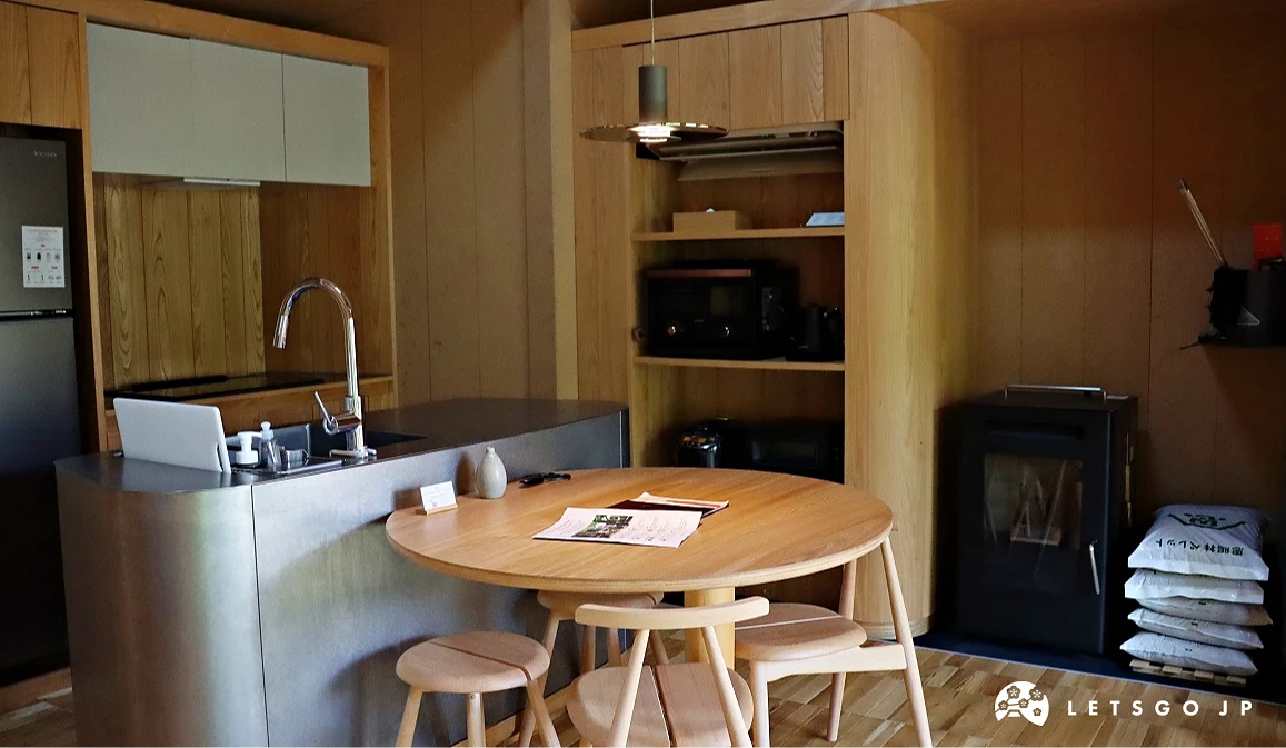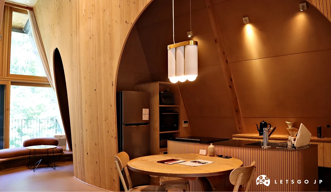 房內傢俱皆為 SANU 原創設計,寢具則嚴選以重構現代寢具為理念的「sinso」,水洗自然的特色質感,能打造高品質的睡眠。廚房內的冰箱備有冷凍白飯、南印度料理名店「ERICK SOUTH」推出的冷凍咖哩包,各式廚房電器如烤箱、炊飯電子鍋,以及調味料等一應俱全,推薦晚上與三五好友一起下廚,飯後再於小木屋前的庭園生火,一起圍著火聊天、盤點旅途中的各個美好回憶。房內也設有配備螢幕的辦公區(限部分房型),可以邊品嚐名店「ONIBUS COFFEE」的濃純咖啡,邊處理工作上的事務。