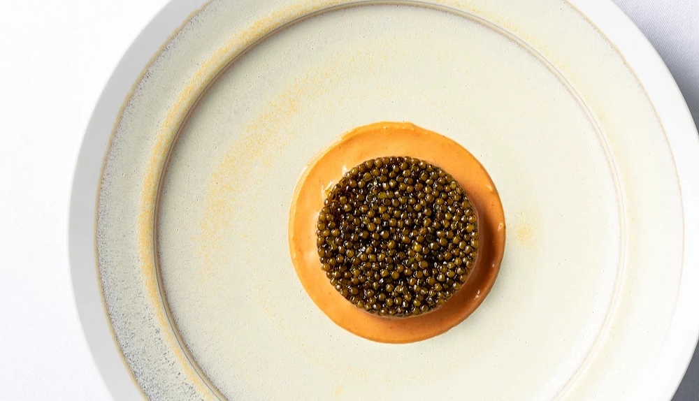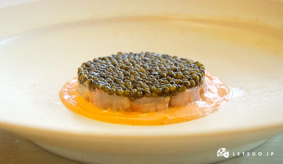 接著進入重點料理。牡丹蝦的蝦身經過極短時間的輕火處理,外層微微收緊,仍保有半透明的質感。入口瞬間能感受到鮮甜的汁水在口中釋放,彈牙的肉質伴隨清爽的檸檬與萊姆醬汁,酸度拉開了味覺層次,與最上層鋪滿的魚子醬鹹鮮交織,粒粒分明的口感既特別又奢侈。