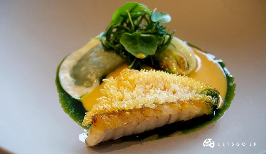 魚料理並不少見,但在此看得見職人堅持,特別使用了和食中的 「鱗燒」技巧,透過烹調時用高溫油脂反覆澆淋魚鱗,讓鱗片一一豎立,不僅視覺效果特別,口感變得像炸物般帶有一咬下就能發出「喀嗤」聲響的香脆感,與柔嫩的魚肉形成對比。醬汁除了加入奶油,還使用了法式料理常使用的香菜「細香蔥」,單吃一種或混合雙醬都很對味,搭配一旁的當季山菜無翅豬毛菜、旱金蓮,微苦的口感也調和了可能會偏膩的味道,達成絕妙平衡。