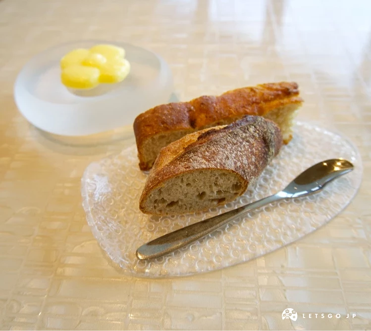 套餐以餐前小點揭開序幕。內容依照季節與食材會不定期更換,比如這次記者就品嚐到了香甜的炸玉米、鹹奶油泡芙與香腸薯球,雖然份量不大卻溫熱暖胃,小前菜的炙燒鰹魚保留了微生的口感,淋上融進哈密瓜的醬汁又增添一股清香,搭配烤番茄、蕪菁與碗豆,充分展現出季節的巧思,也為接下來的料理鋪墊出清晰的基調。口感偏硬的自家製歐風麵包搭配切成花朵形狀的奶油更是一絕!