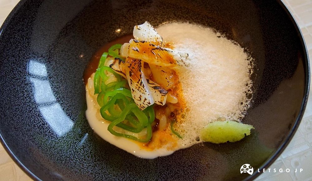 隨之端上桌的燉飯料理也十分精緻。上面鋪上切成細絲、炙烤過的軟絲,外層微焦帶一股炭香,內裡仍保有海鮮特有的水嫩。底部燉飯以糯米椒調味,散發淡淡辛甜,米粒吸收了洋蔥與奶油熬製的醬汁,既濃郁又帶清爽酸度。用出汁打成的白色泡沫狀帶來輕盈口感,讓燉飯不因奶油而顯厚重,整體酸、甜、鮮交錯,香氣、口感層次都令人十分享受。