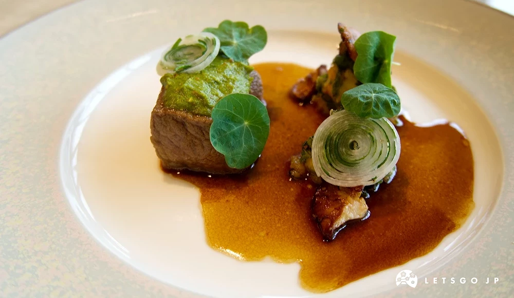 作為主菜登場的熊本縣赤毛和牛,油花分布均勻,煎烤後外層焦香、肉質粉嫩多汁。表層覆蓋黃芥末、山葵等多重調和的醬汁,辛香與清新的平衡感成功中和濃郁肉脂,每一口都大滿足,再搭配一旁外皮酥脆、內裡多汁的紫蘇星鰻天婦羅更是飽足。有趣的是,這些主菜又再點綴上散發草本辛香的金蓮花葉,以及切成極細絲的蘿蔔與香草交相捲製成環狀菜輪,口感爽脆、視覺清新,令人可輕快地享受到最後一口。
