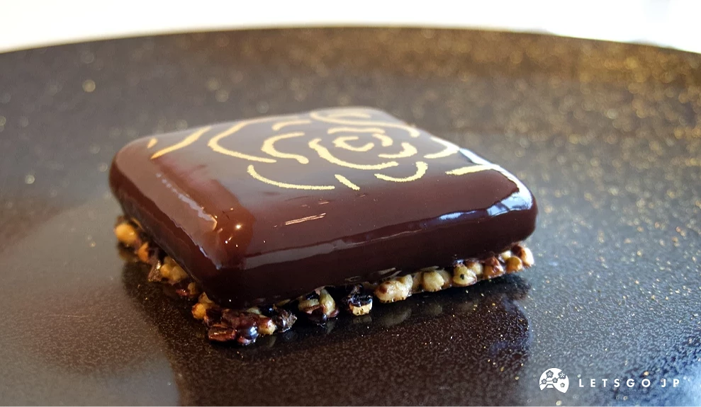 甜點有3種選擇,記者享用了「Le Chocolat Alain Ducasse 東京工房」的巧克力,華麗濃厚的香甜口感,與底部帶有一股焦香的米菓粒達成絕佳平衡,讓人一邊欣賞著表面點綴的金色花紋,一邊心滿意足地品嚐完,為這場餐飲體驗畫下理想的句點。