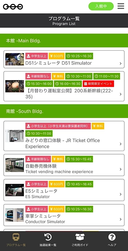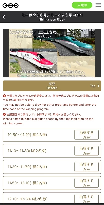 通過驗票進入設施後,當日上午10:00起即可使用 App 參加抽籤。開啟 App 後,螢幕會出現「入館する(Entry)」的按鈕,透過 GPS 確認使用者在館內後,畫面會顯示「入館が確認できました(Successful)」的訊息,便可選擇想參加的體驗項目了。請注意每個人每種體驗一天只能抽籤一次。