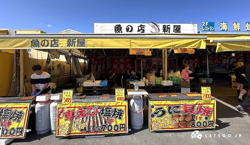 「魚之店 新屋」創業於昭和50年,2024年起轉型為烤天然車蝦與烤海膽專門店。鹽燒車蝦肉質Q彈鮮甜,讓不少客人驚呼「沒吃過這麼厲害的蝦!」。海膽則是放在貝殼裡直烤,濃縮鮮香,風味獨特。市場周邊還有不少烤扇貝、螺肉的攤販,邊逛邊吃非常有逛市場樂趣。