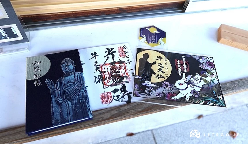 牛久大佛提供三款御朱印,除了一般常見的毛筆字御朱印,另一款為季節限定,此外還有胎內參觀限定的版本。御朱印帳款式豐富,從傳統到織上大佛像的都有,讓人能挑選心儀款式搭配收藏。