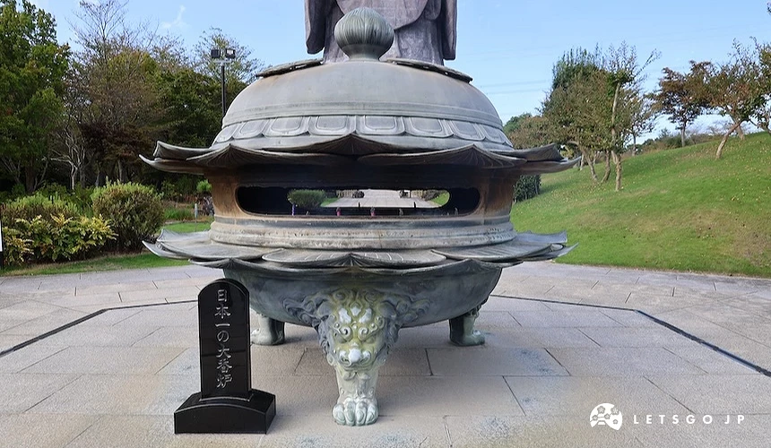 園區內有許多絕佳取景位置。入口「發遣門」內供奉釋迦三尊像,走入後回望,可在玻璃上看到大佛的倒影,畫面莊嚴壯觀。「本願莊嚴之庭」是依照古代作庭文獻打造的傳統日式庭園,內有瀑布、涼亭與鯉魚池,充滿禪意。「群生之海」在春天時櫻花與芝櫻染成粉色世界,池水同時映照出大佛和花朵,是絕對專程必要來看的美景。「定聚苑」則是季節花海區,5月、10月還能體驗摘花,適合打卡拍照。大佛像前還有全日本最大的大香爐,青銅製香爐在佛煙繚繞下,更顯莊嚴。