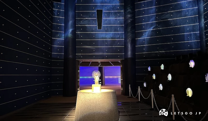佛像的內部稱為「胎內」,進入胎內的第1層是「光的世界」。一開始,參觀者會先陷入約一分鐘的黑暗,象徵煩惱與無明。接著大門緩緩打開,耀眼的光線傾瀉而入,正中央金色佛像閃耀光芒,兩側的十二尊佛像分別散發不同光輝,代表十二因緣。這種從黑暗到光明的轉換,象徵人生由痛苦走向希望的過程,揭開了參觀旅程的序幕。