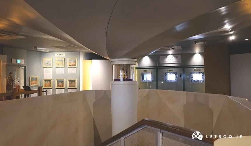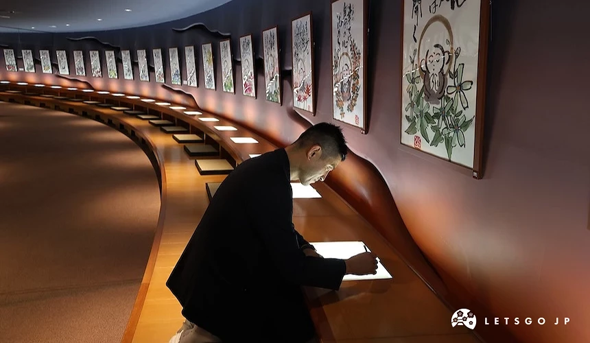 2樓空間規劃成二部份,一部份是上樓時才會經過的「展示間」,可以看到大佛建造的經過。另一部份是下樓時才會經過的「知恩報德的世界」,這裡提供參拜者抄經體驗,透過一筆一畫,參拜者能專心靜心,體驗與自我的對話。此外這裡還能購買金箔,並將其貼在大佛的蓮花座上,象徵供養與祈願。這個過程既具宗教意義,也能帶來實際參與迴向眾生的充實感,這是一種難得的文化體驗。