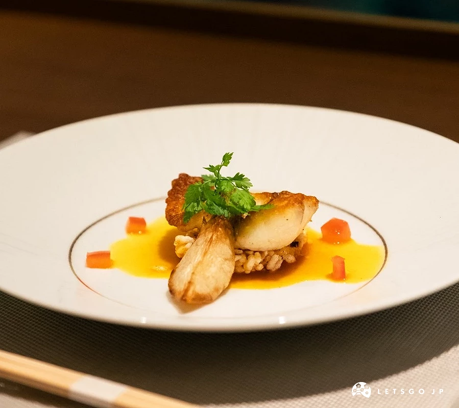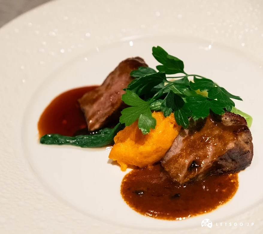 住客可預約每日僅供應10組的晚間套餐,同樣位於2樓「SACHI」餐廳。餐點共7道料理,以「旬」為主題,嚴選豐洲市場當季食材,打造出精緻法式料理。從干柿與鴨肝慕斯開胃菜開始,一路享用北海道干貝與蔬菜燉菜、信州菇菇酥皮湯等溫潤料理。主菜是香煎國產牛排搭配紅酒與香草雙醬,肉質相當軟嫩,最後以蒙布朗與黑醋栗雪酪完美收尾。邊吃飯邊欣賞迷人灣景,好好享受東京夜晚的度假氛圍(※ 註:晚餐菜色根據不同時期而異)。