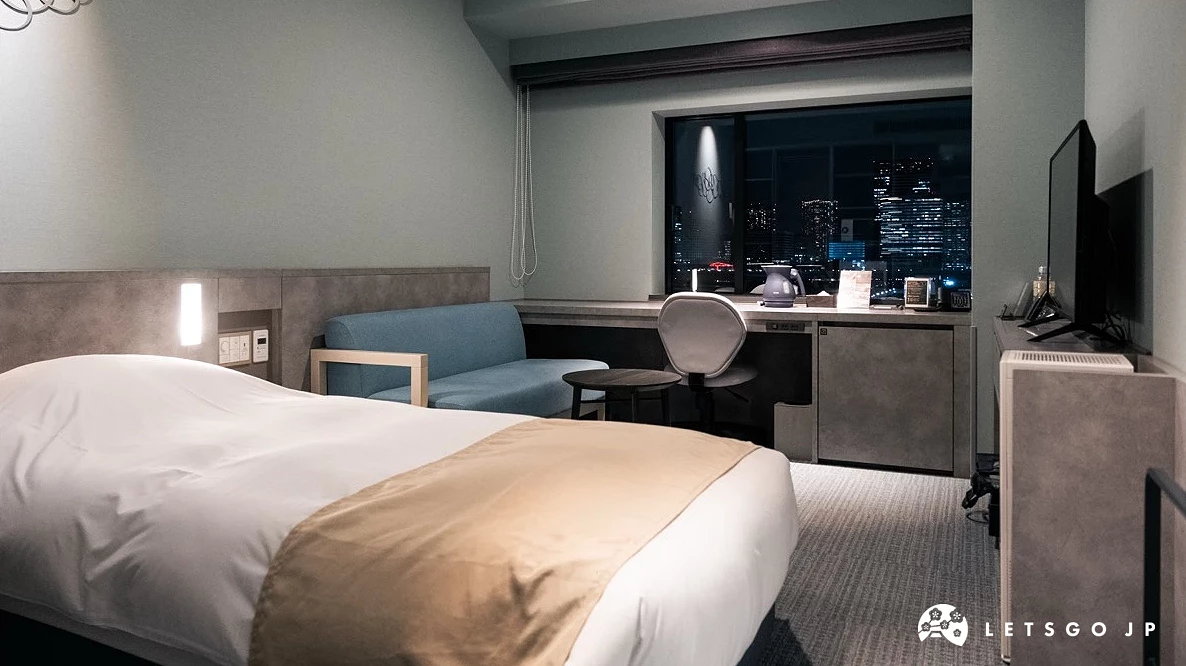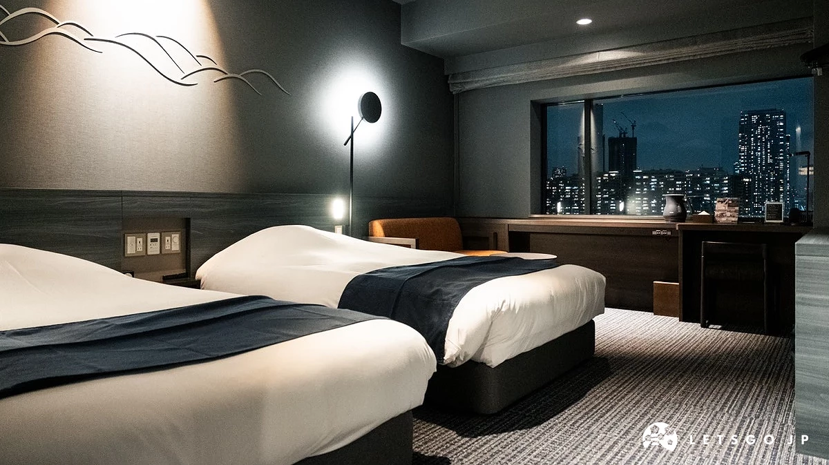 如果不需要這麼大的空間,追求更實惠的住宿體驗,但仍然想享受東京灣美景,推薦約29平方公尺(約8.8坪)的「豪華雙人房」(Deluxe Twin)。房內以米色與藍色調打造沉穩氛圍,雖然沒有大片落地窗,但窗外美景仍然不減震撼。房間同樣備有電視、附加濕功能的空氣清淨機、吹風機等備品,無論白天或夜晚都能好好享受東京灣靜謐時光。
