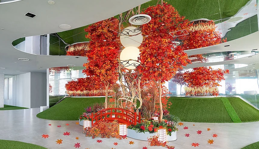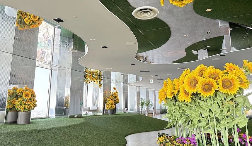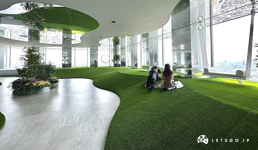 「展望之丘」是由人工草皮與會隨著季節變換的花草植物所環繞之休憩空間,高高低低的地勢彷彿是將小山丘直接搬到空中,呈現出不可思議的氛圍。靠近落地窗處特別設置了造型特殊的椅子,可以拍出像在空中盪鞦韆的夢幻畫面。另外,設施還貼心準備了許多野餐墊,選個喜歡的位子就能自在地席地而坐。白天開闊舒暢,夜晚氣氛浪漫,一天當中不同時段都能看到不同的景色,感受多種情調。