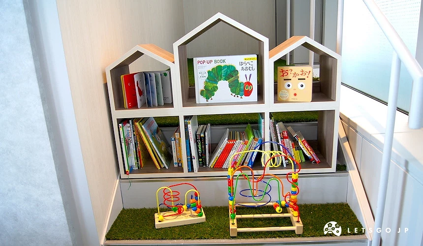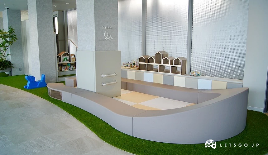 「展望之丘」不只適合大人來約會或放鬆,也非常適合親子同遊。特別針對了嬰兒設計了圓弧型的爬行空間,全部舖上軟軟的墊子不怕跌倒撞傷,並提供許多有趣可愛的繪本和知育玩具,孩子可以盡情放電。