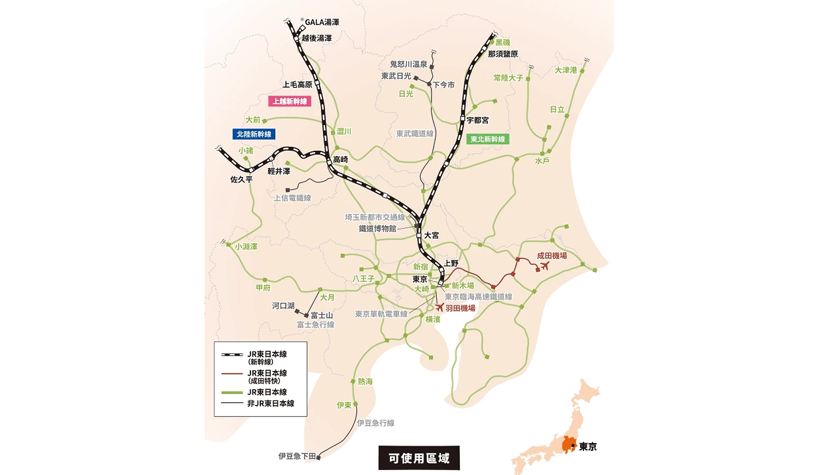 ・不可搭乘:東海道新幹線、JR 巴士。 ・搭乘「栗橋~下今市」區間,僅限搭乘與東武鐵道直通之特快列車。 ・不可自東武鐵道車站站內搭乘非直通 JR 之特快列車。 ・GALA 湯澤站僅於冬、春兩季對外營業。 |