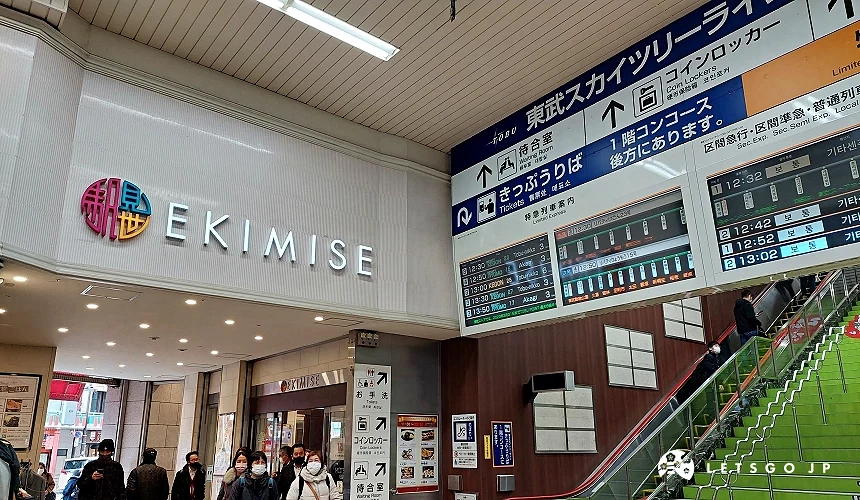 如果要轉乘東武鐵道前往日光、鬼怒川,可以走出口7,上樓梯之後就會到一樓的購票處以及東武鐵道旅遊中心,在這裡可以買觀光套票,出口7也可以直通商業設施EKIMISE。出口6和出口8會經過很古老的淺草地下街,如果想要走捷徑到新仲見世通的話可以走出口6,但是這個出口比較陰暗。